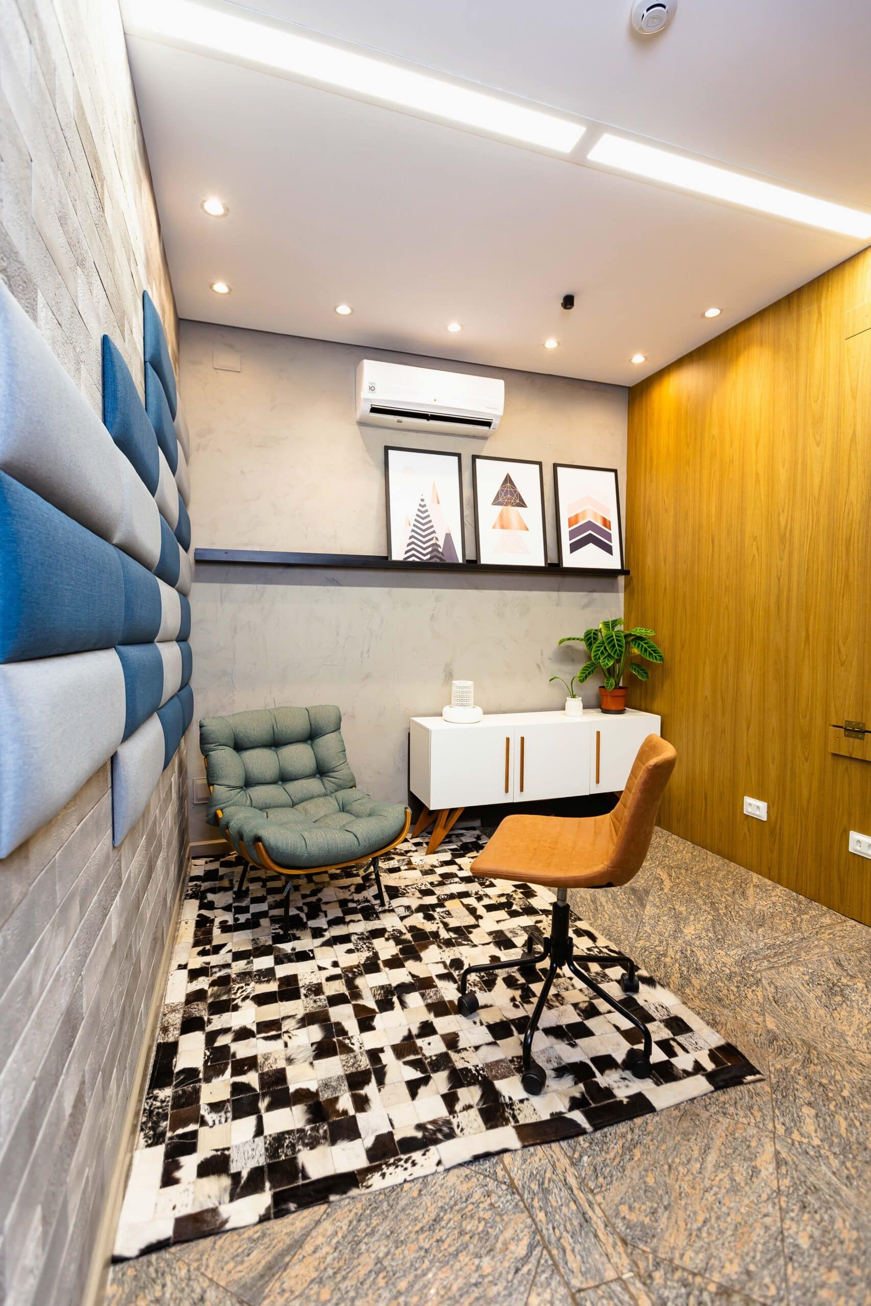Com direito a poltrona costela do designer argentino Martin Eisler e tapete em couro, a Sala Talk mostra exatamente como é receber seus clientes ou pacientes aqui: pura inspiração.